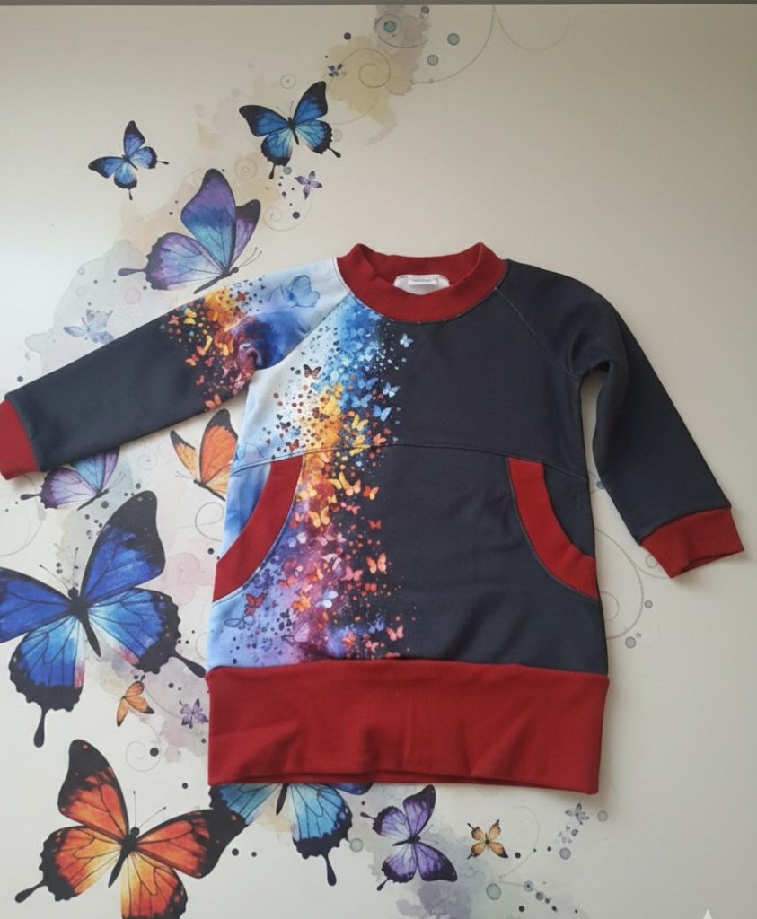 Hledáte pro svou malou parádníci kousek,který v davu jen tak nezanikne?Tato mikina kombinuje maximální pohodlí s uměleckým desingem,který připomíná magickou noční oblohu plnou barevných motýlů.