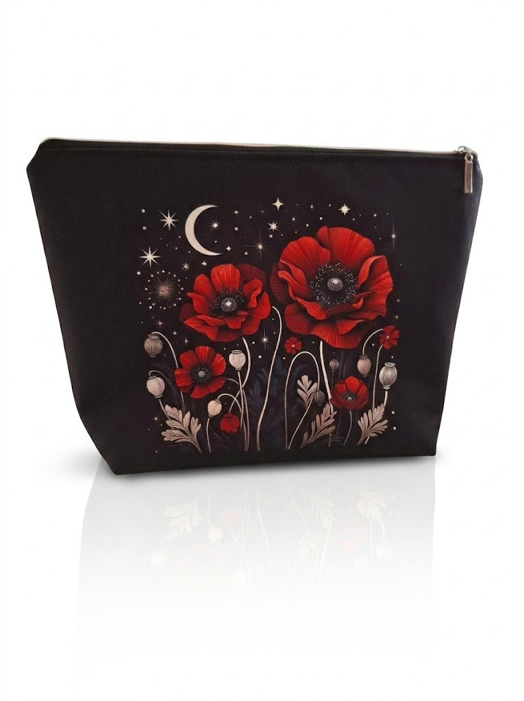 Objevte kouzlo noci s touto prostornou kosmetickou taškou z dílny Tvorky.cz. Fascinující ilustrace sytě červených vlčích máků pod měsíčním srpkem a třpytivými hvězdami vás přenese do světa fantazie při každém pohledu. Je to ideální doplněk pro ženy, které hledají spojení praktičnosti s uměleckým a trochu tajemným designem.